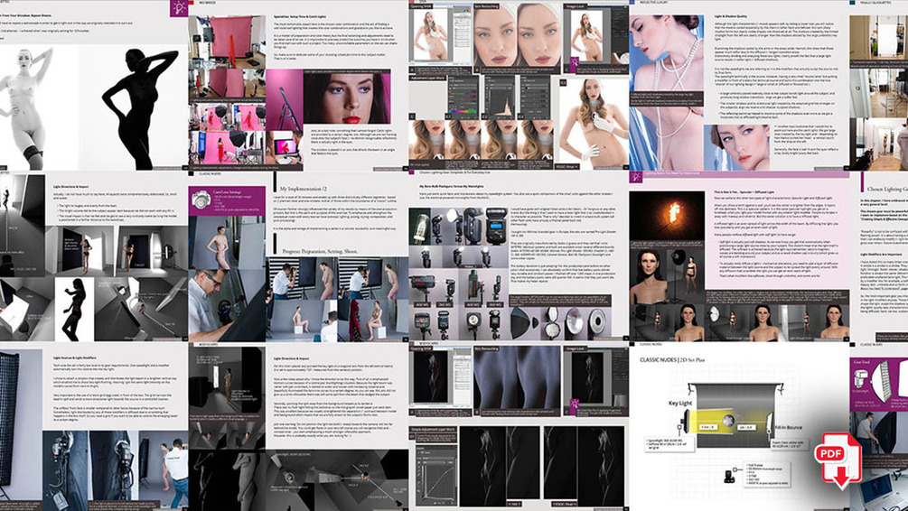 • Building The Shoot: Every Showcase is broken down into Idea Development, Concept Creation, Lighting Design, 3D Lighting Setup, Posing Aspects, Specific Specialities, and Post-Processing
